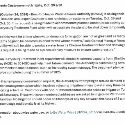 As you know, all of the water delivered to Callawassie, Spring, and Harbor Islands comes from Beaufort-Jasper Water & Sewer Authority. They announced that they are shutting down part of their plant on Tuesday and Wednesday this week while doing some construction. As a result, you are asked to limit […]