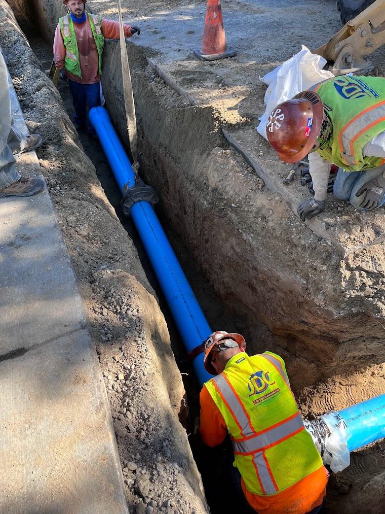 Sometimes the surrounding soil is all that holds grey plastic pipes together; the pipe is susceptible to breaking when the soil is disturbed. Suburban’s contractor is hard at work digging exploratory holes to confirm the location of conflicting underground utilities before the new pipe can be installed. While excavating near grey plastic pipes, they have been experiencing leaks resulting in emergency shutdowns that interrupt service to customers while they repair the pipes.