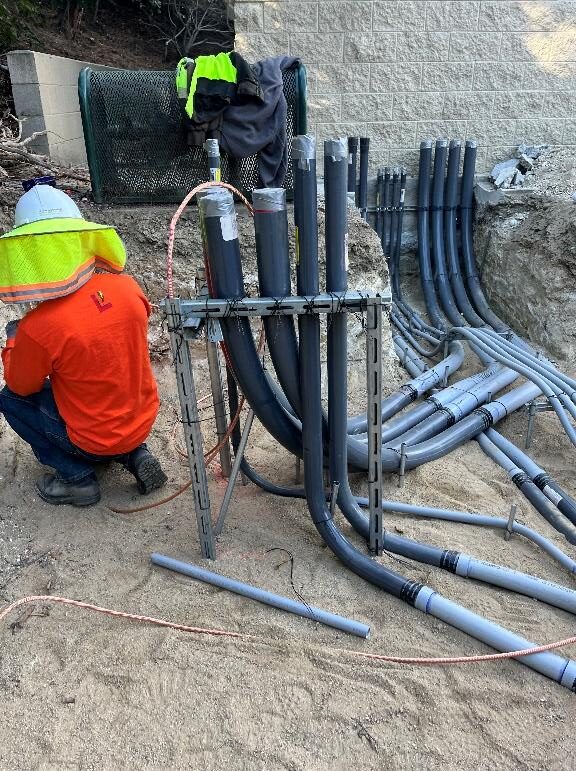 The contractor is installing electrical conduits and wiring to connect the generator to an automatic transfer switch (ATS) that automatically turns on the generator during SCE power outages.