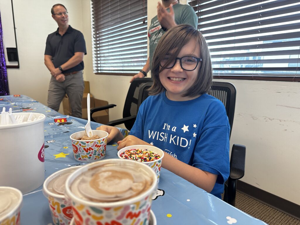 Cooper can play Zelda music by ear and wants to be a coder when he grows up. Tim Williford, vice president of operations at Texas Water Utilities, presented Cooper with some of his favorite things including a Golden Snitch fidget spinner, a Zelda sticker book, and all things rainbow, including Amy’s Ice Cream topped with rainbow sprinkles.